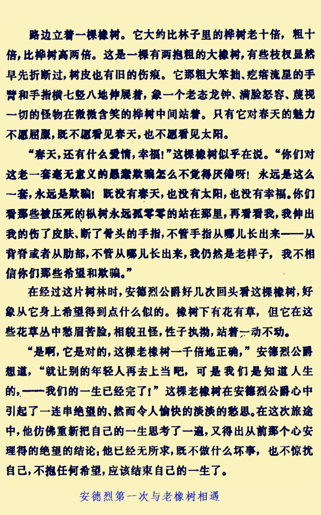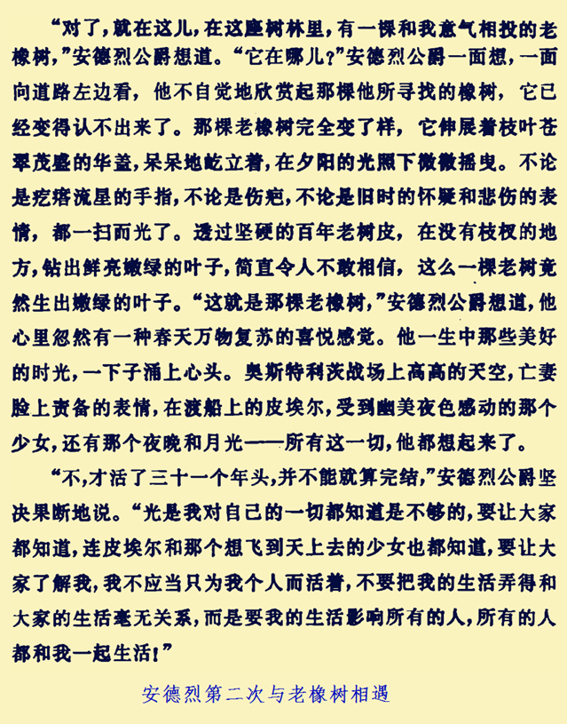 托爾斯泰善于通過(guò)描寫(xiě)心理變化的過(guò)程展示人物思想性格的演變,俄羅斯文藝?yán)碚摷臆?chē)爾尼雪夫斯基將這種藝術(shù)特色命名為“心靈辯證法”。《戰(zhàn)爭(zhēng)與和平》中的著名片段“安德烈與老橡樹(shù)的兩次相遇”即運(yùn)用心靈辯證法的方式寫(xiě)出了安德烈的內(nèi)心轉(zhuǎn)變。