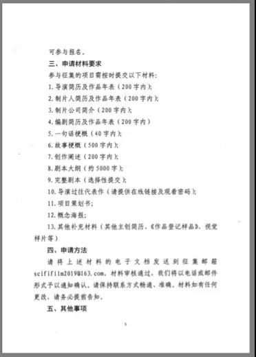 請將上述材料的電子文檔發送到征集郵箱scififilm2019@163.com,材料審核通過,我們將以電話或郵件形式予以通知確認。請保持聯系方式暢通、準確。材料如有任何更改,請務必提前告知。