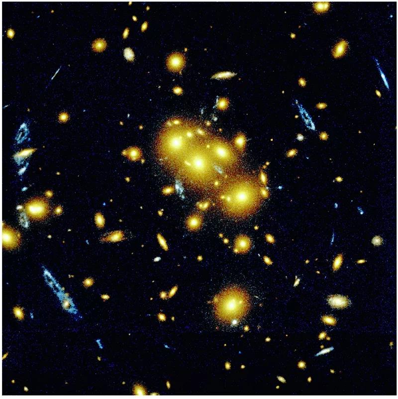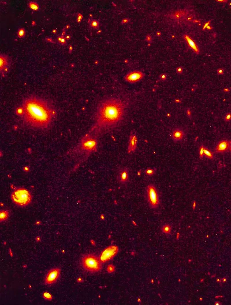 在宇宙的年齡只有現(xiàn)在的五分之三時,星系團是宇宙代表性的景觀。哈勃望遠鏡已經在軌道上運行了22年,通過它的持續(xù)觀測,我們得到了星系團的影像。有些星系看上去互相處在對方的引力場里。這樣的相互作用在離我們較近的星系團中相當少見,說明宇宙確實在演化。