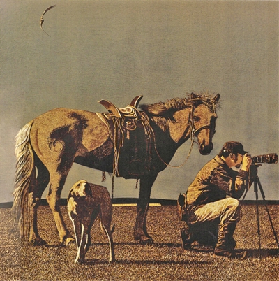 胡日查的套色凸版作品《聽見草原——聚焦》不但為自己涂抹了生命的底色,也開闊了表現(xiàn)的視野。站立的馬,蹲坐的人,嚎叫的狗,盤旋的鷹,構(gòu)成了草原悠遠(yuǎn)的意境。從馬的回首到狗的昂頭,再到人的遠(yuǎn)眺,作者巧妙地將視覺焦點轉(zhuǎn)移至相機(jī)的長焦鏡頭上。畫面凝聚了主題,視覺引發(fā)著聽覺,濃縮的景象釋放出想象,讓觀者在虛實間徜徉慢步,讓意圖在想象中合成。一列飛馳的機(jī)車橫貫大地,正欲破圖而出,所謂“聽見草原”即源于此。大地的離離菒草被覆著陽光的暖意,草原的豐富中又添加了機(jī)車的鳴響,視覺與聽覺在敘說著時代的變化,韓愈的詩句“鳴笛急吹爭落日,清歌緩送款行人”正是對應(yīng)了畫面的意境。
