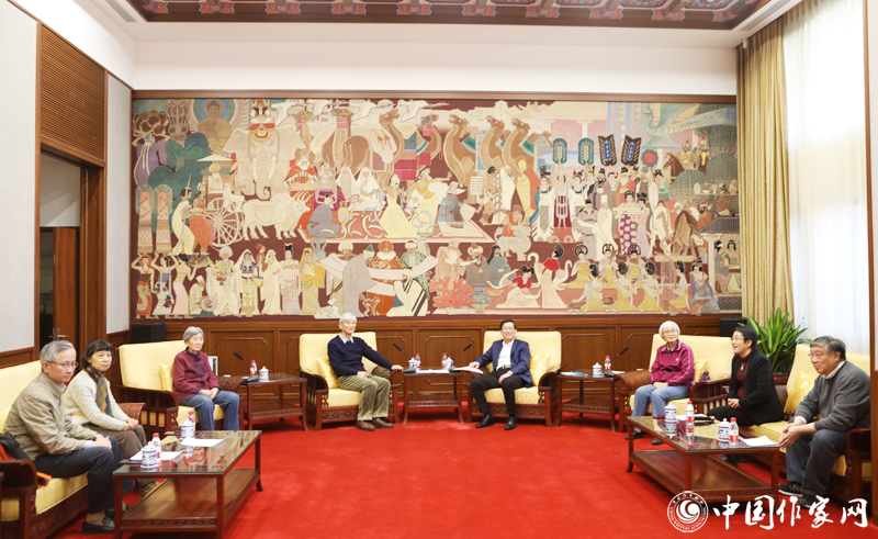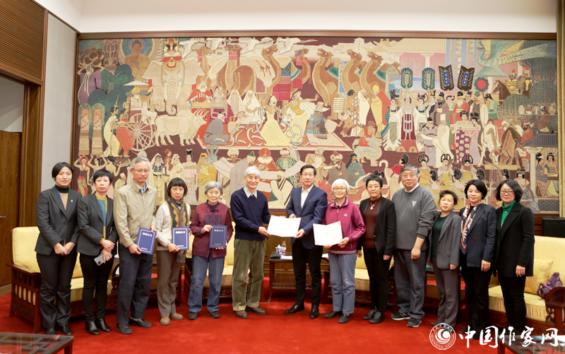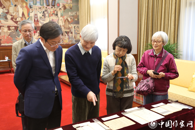 國家圖書館館長饒權(左二)與楊晦先生子女共同觀看楊晦先生手稿等珍貴文獻