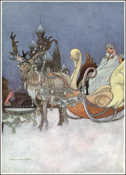 以前介紹過查爾斯·羅賓遜為莎士比亞十四行詩所作的插圖。倫敦的達(dá)克華斯出版公司,在二十世紀(jì)上半葉以善于發(fā)掘優(yōu)秀的文學(xué)作品而蜚聲英美。1913年,他們聘請羅賓遜為一部限量發(fā)行的王爾德童話集創(chuàng)作了一整套插圖,初版只出售兩百五十部,不過后來曾多次重印。這幅彩色插圖,將故事的開頭描摹得惟妙惟肖:公主坐著六匹馴鹿拉的雪橇從芬蘭來出嫁:“雪橇的形狀像一只金色的大天鵝。小公主本人就坐在天鵝的兩只翅膀中間。她那件白鼬皮的長披風(fēng)覆蓋到她的腳下,頭上戴了一頂銀色織物做的小帽子,臉色蒼白得就像她向來所居住著的雪宮的顏色。”