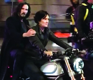近日,該片正在美國舊金山拍攝動作戲,有網友拍到的幾段現場拍攝視頻曝光。當中凱莉扮演的崔妮蒂依然穿著經典的黑色皮革連身衣,騎著重機車在路上狂飆,基努·里維斯扮演的尼奧則坐在她身后。另一個片段是兩名演員在高空吊威亞演繹動作戲,看起來像崔妮蒂和尼奧的兩人,從大樓樓頂飛下來,場面相當驚險。