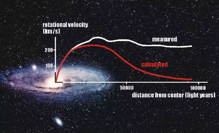 圖2:仙女星系(Andromeda Galaxy)中恒星的旋轉(zhuǎn)速度隨距離的變化曲線。紅色的曲線為無暗物質(zhì)假設(shè)的理論預(yù)言,白色曲線為觀測得到的曲線。兩條曲線在遠(yuǎn)離星系中心時的不同被認(rèn)為是暗物質(zhì)存在的關(guān)鍵證據(jù)之一。圖片來源:https://phys.org/news/2011-12-dark.html