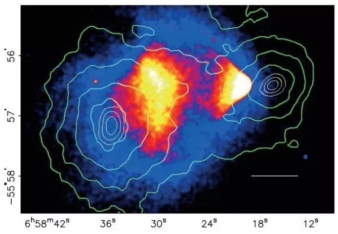 圖3:合并星系團(tuán)中的熱氣體分布和總質(zhì)量分布對比圖。中間的紅藍(lán)色代表著熱氣體的分布,高亮度表征高密度區(qū)域;綠色等高線描述合并星系團(tuán)的總質(zhì)量分布。合并星系團(tuán)中熱氣體中心和引力中心不重合是暗物質(zhì)存在的另一個關(guān)鍵證據(jù)。圖片來源:https://astrobites.org/2016/11/04/the-bullet-cluster-a-smoking-gun-for-dark-matter/