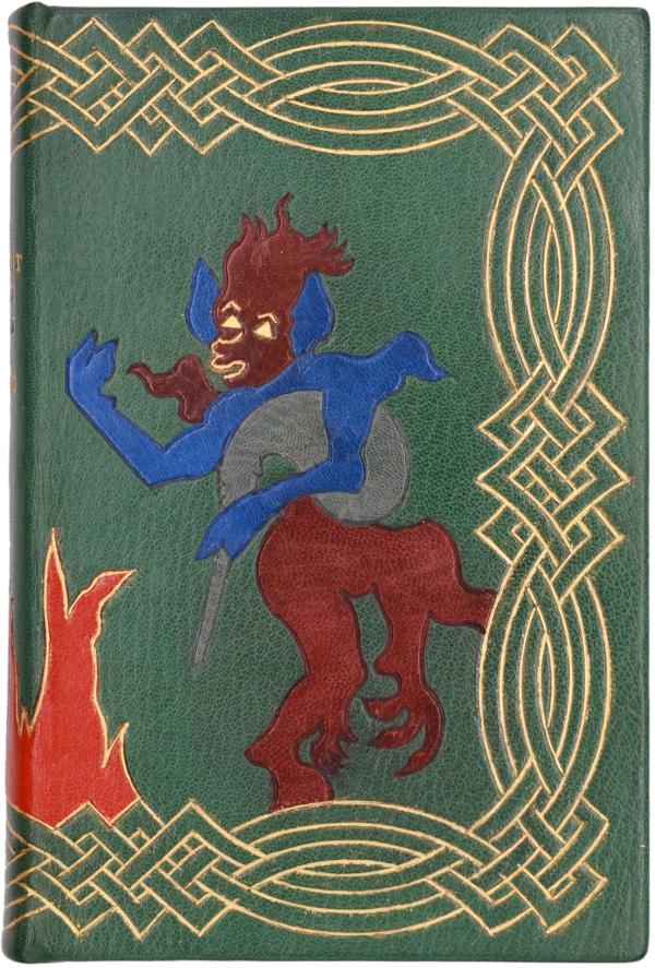 《一個青年藝術家的畫像》( A Portrait of the Artist as a Young Man),倫敦:Jonathan Cape Ltd.,1928年六刷(此著初版由倫敦自我主義者出版社于1916年推出)。此冊為喬伊斯題贈本,贈言曰:“贈George Cosgrove,詹姆斯·喬伊斯,1929年6月5日,巴黎。”與《尤利西斯》和《芬尼根守靈夜》均推出喬伊斯簽名限印版不同,此著喬伊斯簽名甚罕見。這是美國著名裝幀家重新裝幀的作品。綠色哈麥丹山羊皮全皮裝。書封的裝幀設計靈感來自愛爾蘭中世紀手稿里首字母的彩飾圖案。燙金印中世紀凱爾特結為邊框,框中以彩色鑲皮呈現象征沖動的魔鬼和地獄的火焰。包布書匣上是褐色貼皮的都柏林城市天際線。