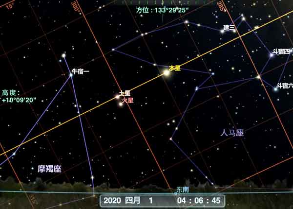 2020年4月1日凌晨4:06北京地區東南方的星空模擬。圖片來源:Redshift Pro截圖