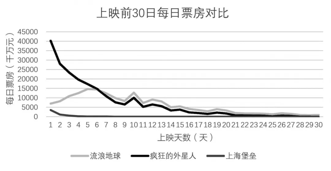 圖2 電影《流浪地球》《瘋狂的外星人》《上海堡壘》上映前30日每日票房對比