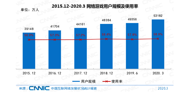 2015.12-2020.3網絡游戲用戶規模及使用率