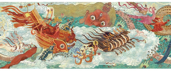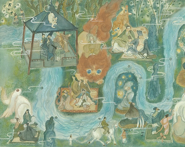 澎湃新聞:在書中“曲水流觴”場景的兩個大拉頁上,人物之間出現(xiàn)了很多動物和神獸的形象,有些畫面占比還非常大,這個設(shè)計是有什么特別用意嗎?