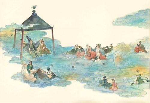 澎湃新聞:如果說《洛神賦》的故事性還比較好的話,那《蘭亭序》就需要構(gòu)建一個能夠同時推動敘事和繪畫語言的新故事結(jié)構(gòu)去表現(xiàn)了,這個將水人物化的想法是您還是文字作者的創(chuàng)意?怎么想到要用這樣的方式來講述這個故事的?