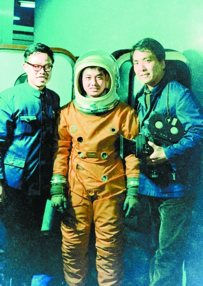 1979年在拍攝電影《載人航天》時(shí)進(jìn)入航天基地,葉永烈(左)與宇航員合影。