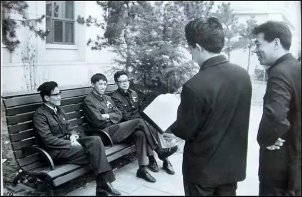 在葉永烈眾多的收藏資料中,有一張黑白照片讓人印象深刻。照片中,《于無聲處》作者宗福先、《傷痕》作者盧新華和葉永烈坐在一條長椅上,畫家陳逸飛站著為他們畫速寫,陳逸飛旁的則是上影廠青年導演宋崇。