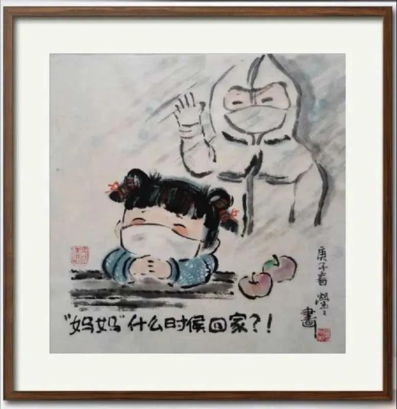 著名國畫品牌《中國娃娃》的作者、畫家楊瑩瑩創作了童心感人的《抗疫娃娃組畫》。談起創作緣起,她說:“2020年早春,我拿起筆,從孩子的視角看疫情,把我的所感、所想通過中國娃娃表達出來。”“在這次疫情中,孩子們經歷了人間的大悲,也看到了人間的仁愛。他們天真無邪,童心異趣,充滿為人之初的真善。我用畫筆記下這段特殊的日子。”[2]