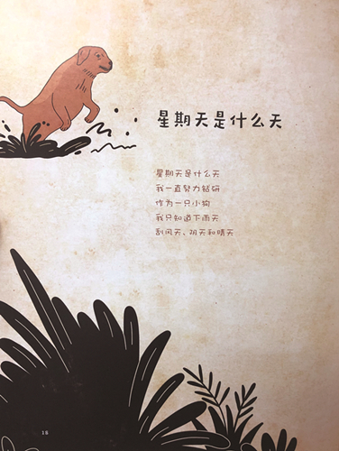 倘若問我最喜歡18首詩中的哪一首,這個問題恐怕很難回答,這18首詩哪首我都挺喜歡的,因為都是像我的孩子一樣,是我的思想和構思,加上我創作的時候努力投入完成的。如果說非要認可哪一首最好,我覺得恐怕是《星期天是什么天》,這首詩我還比較滿意,因為星期天大家都習以為常,在習以為常中發現它的非常性,這是我突發的靈感。我努力發掘小孩子和小狗對星期天與眾不同的感受,因為星期天對他們意味著釋放、歡樂、郊游,還有很多和朋友們的聚會,所以我覺得我這首詩發現了一個獨特的視角。星期天是什么天?就是一個小狗開心的、盼望的、特殊而平凡的一天,背后的故事是我曾經帶著大咖、小白和我們家新來的小狗牛妞到北京郊區的一個梨園去做客。在那個梨園里面,梨子碩果累累,同時草地上還有一些雞,然后三只小狗和雞們進行了猛烈的追逐,我覺得在那片郊區的田地上,小狗們的天性得到了特別大的發揮,它們是向大自然、向秋天、向梨樹上面的果子表示一種小生命的真誠的敬意,所以《星期天是什么天》就這樣完成了。