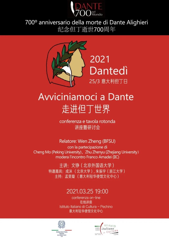 2021年是意大利詩人但丁逝世700周年,世界各地正以豐富多樣的形式紀念這位中世紀最偉大的詩人和歐洲人文主義的先驅。一年前,意大利文化遺產與活動部將每年3月25日命名為“但丁日”(Dantedì),號召意大利乃至全世界各國人民銘記這位人類世界偉大的詩人和思想家,誦讀其作品,傳承其思想,彰顯其精神。