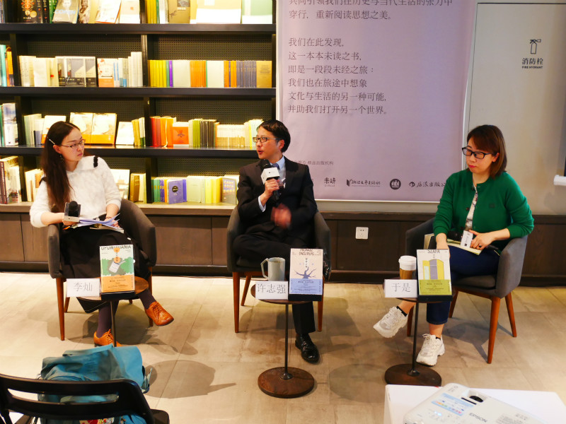 3月28日,浙江大學(xué)比較文學(xué)與世界文學(xué)研究所教授許志強(qiáng)(中),文學(xué)翻譯家、作家于是(右)與文學(xué)編輯李燦(左)做客單向空間杭州樂堤港店,就諾貝爾文學(xué)獎得主托卡爾丘克新書《糜骨之壤》展開對談。