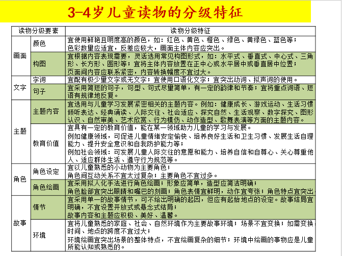 以3-4歲兒童讀物為例,圍繞10個要素的分級特征描述。