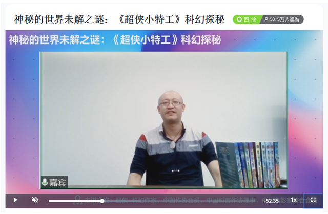 5月8日晚7點,科幻作家超俠在線上為讀者和青年科幻作家帶來“神秘的世界未解之謎:《超俠小特工》科幻探秘”直播講座。本次活動由中國科學技術出版社有限公司主辦,中國科普作家協會科幻創作研究基地承辦,科創中國、科技工作者之家、科普中國提供支持?;顒釉诳萍脊ぷ髡咧摇⒖破罩袊?、微博、抖音、新華網、知乎、嗶哩嗶哩等多個平臺同步直播,線上觀看人次超過50萬。