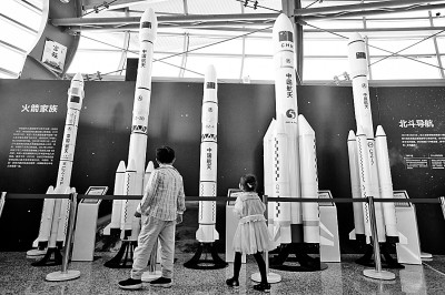 5月22日,小朋友在南京科技館舉行的航天科普展上觀看展出的火箭模型。蘇陽攝/光明圖片