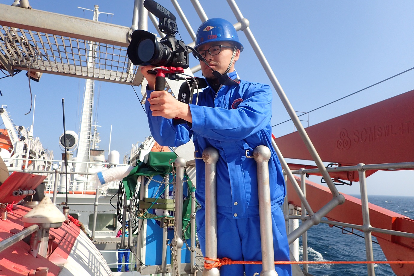 作者跟蹤拍攝蛟龍號在太平洋開展科學考察,此時科考隊員正在為蛟龍做保養,作者舉起攝像機記錄每一個工作瞬間