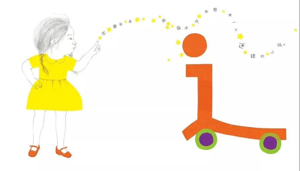 但這種跨文化中最無可替代的變形,恰好是漢字最獨特之處,我相信中國的孩子一定會愛玩這樣的游戲。插畫家為了將這個游戲進行到底,征求詩人的同意,將原詩的最后一句“我是一個幸福的小孩”改成了“我是一個幸運的小孩”,為什么呢?因為“運”字有走之底呀,借著它,迷路小孩的滑板車終于從封面滑到了封底!好吧,滑板車也需要回家。