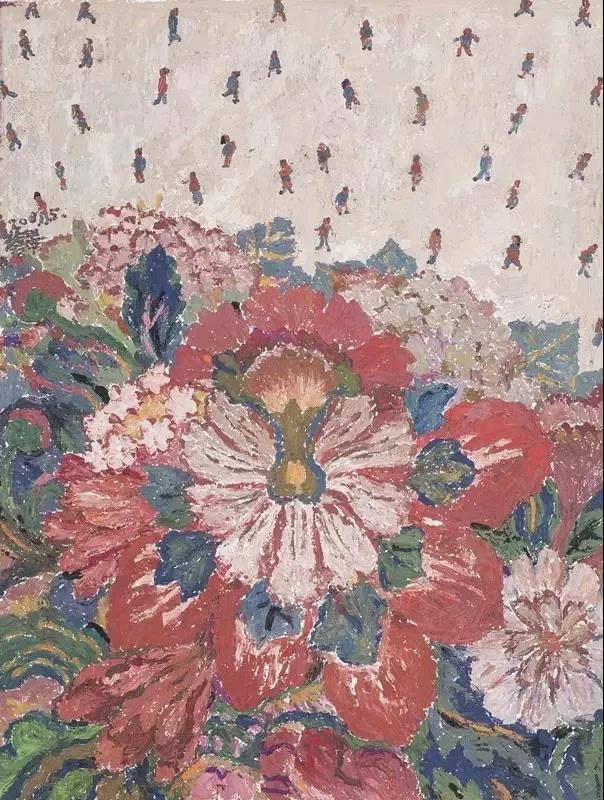在這個(gè)系列里,我想說(shuō)的話也有很多,我是想通過(guò)畫(huà)來(lái)強(qiáng)調(diào)。在里面,你可以看到人的三種境界,有的人很小,有的人和花一般大,有的人和花是分不清的,融合在一起的。我呼吁一種平等、和諧的關(guān)系,這樣的想法在審美上也會(huì)有所表現(xiàn),所以當(dāng)我畫(huà)起花來(lái),往往是滿滿當(dāng)當(dāng)?shù)摹?/p>