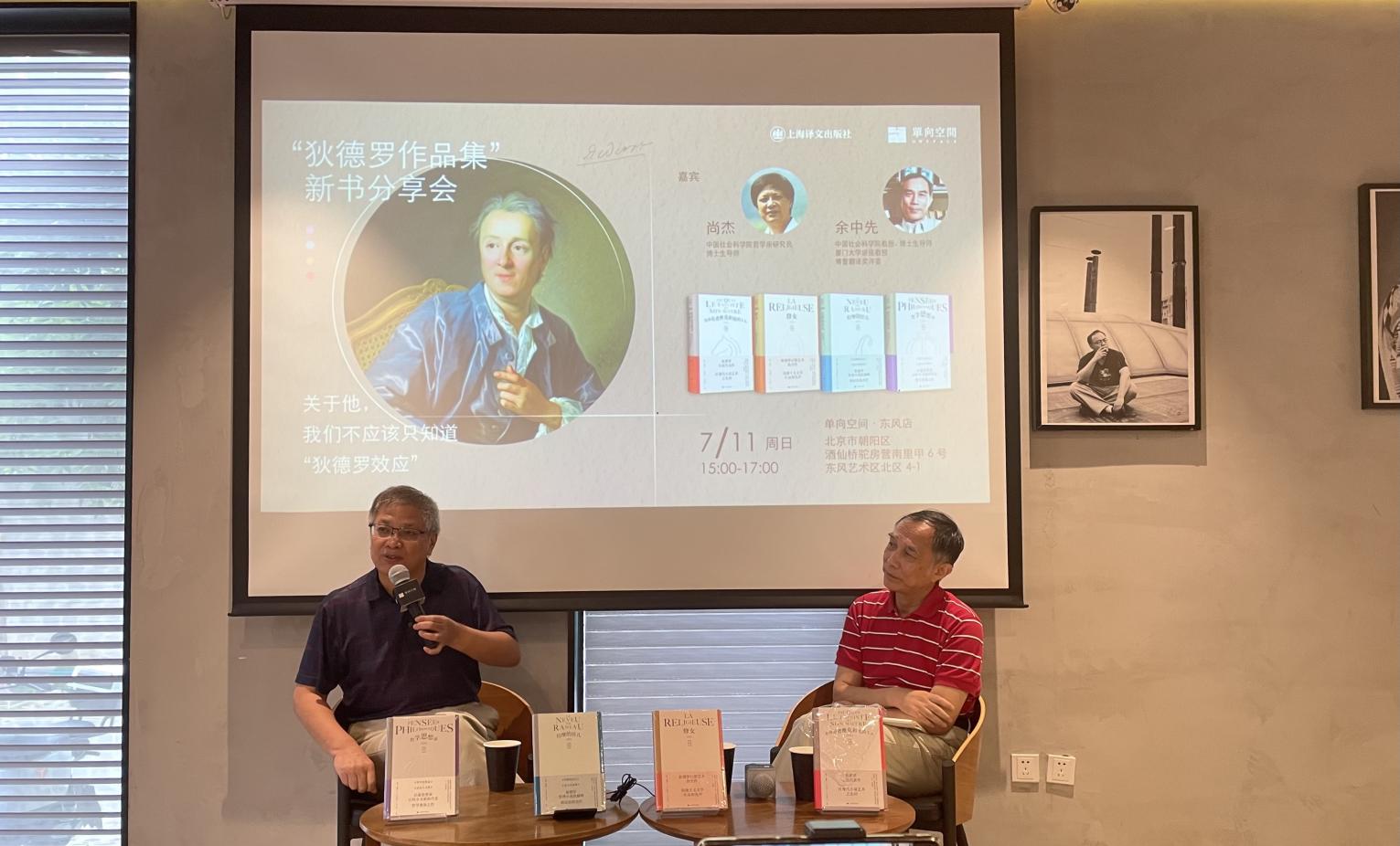 7月11日下午,上海譯文出版社在北京單向空間東風店舉辦以“關于狄德羅,我們不應該只知道狄德羅效應”為主題的新書分享會,中國社會科學院哲學所研究員尚杰和法語文學翻譯家余中先共同講述狄德羅在文學和思想等方面的貢獻。分享會由上海譯文出版社狄德羅作品集策劃編輯李月敏主持。