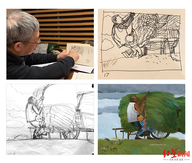 朱成梁提出了許多需要確認的問題:故事發生的時節?房子是什么樣式?院子里都有什么?旁邊有沒有菜地或農田?里面都種了些什么?爺爺的手推車是什么樣式?用什么樣的繩子去捆草?草是什么樣的?大河有多寬?河堤是什么樣子的?
