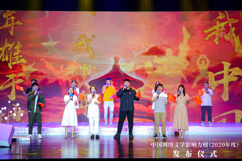 9月16日晚,中國(guó)網(wǎng)絡(luò)文學(xué)影響力榜(2020年度)發(fā)布晚會(huì)現(xiàn)場(chǎng),在深圳龍崗文化中心大劇院的舞臺(tái)上,十幾個(gè)年輕人手揮著國(guó)旗,有些羞赧地唱著《少年中國(guó)說》,逐漸進(jìn)入狀態(tài)后,愈發(fā)慷慨激昂的歌聲令人熱血澎湃,仿佛年輕的他們就是這首歌最好的注腳。