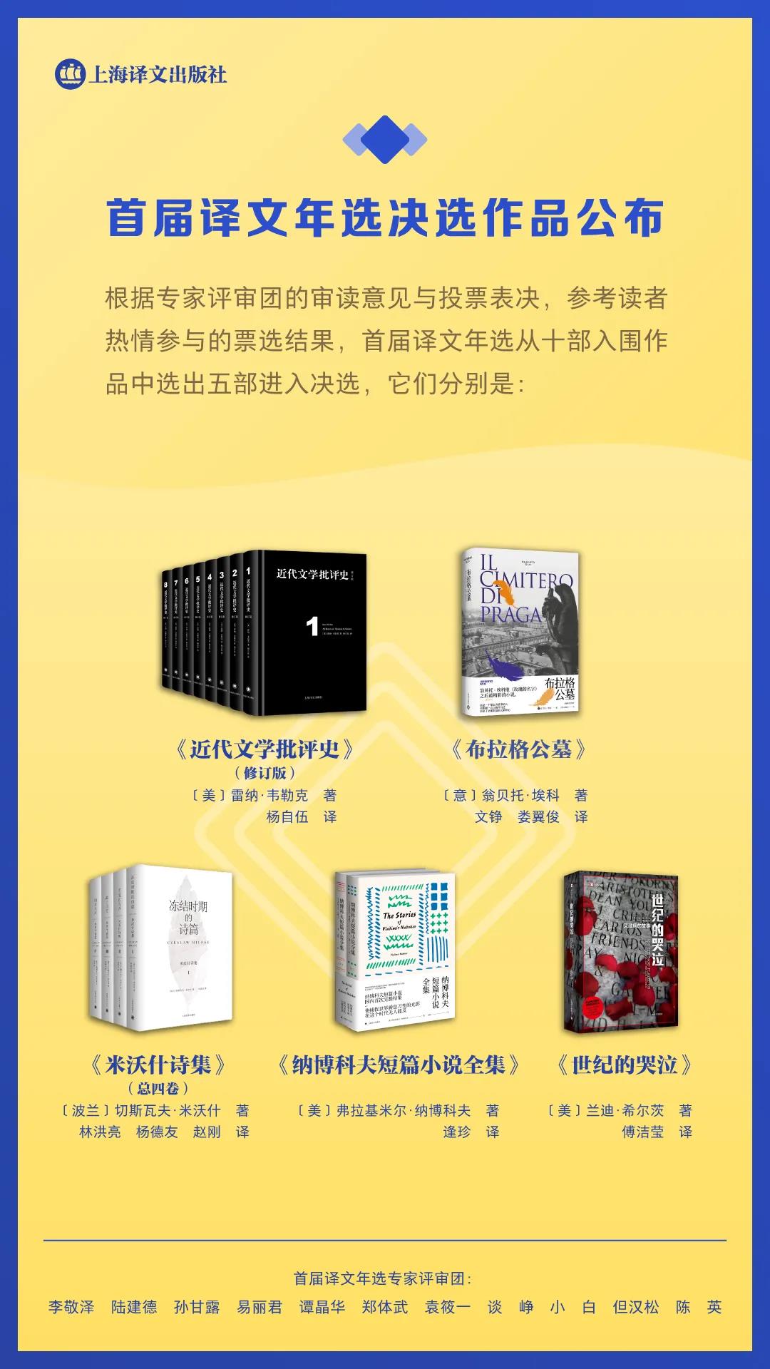 根據(jù)專家評審團的審讀意見與投票表決,參考讀者熱情參與的票選結(jié)果,首屆“譯文年選”從10部入圍作品中選出5部進入決選,它們分別是: