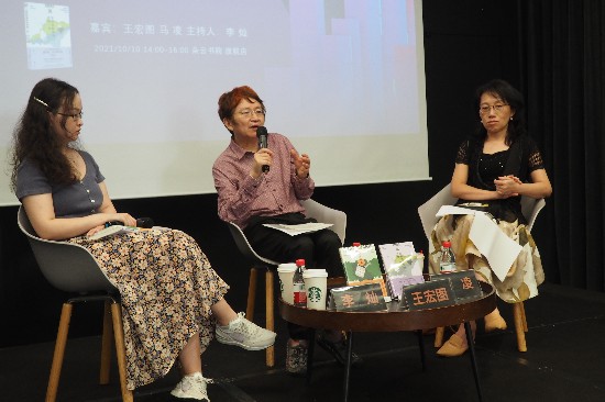 10月10日,復(fù)旦大學(xué)中文系教授、評論家王宏圖(中),復(fù)旦大學(xué)新聞系教授、評論家馬凌(右)與文學(xué)編輯李燦做客朵云書院旗艦店,就托卡爾丘克的長篇小說《世界墳?zāi)怪邪材取ひ氛归_對談。
