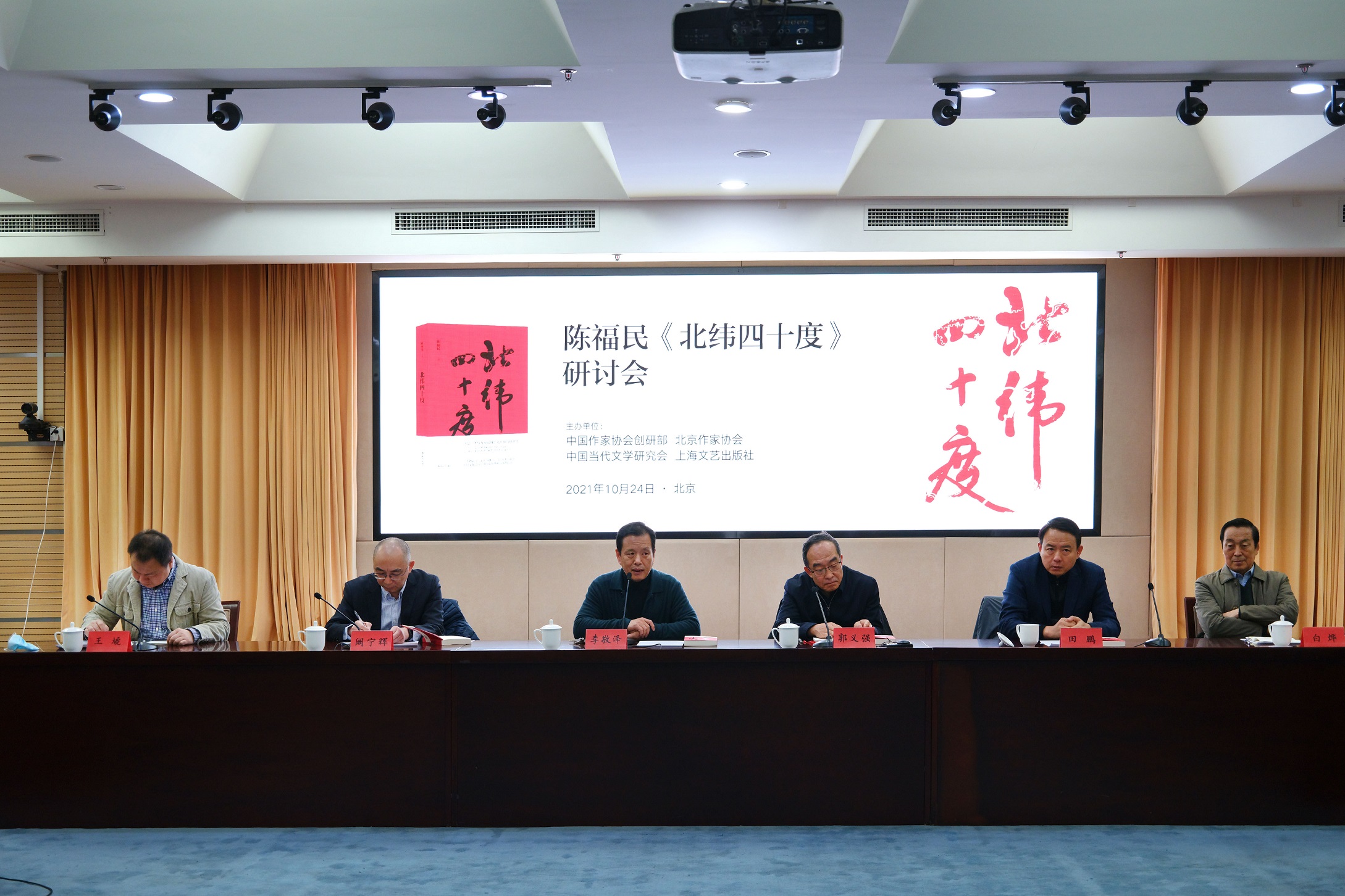 10月24日,由中國作家協會創研部、北京作家協會、中國當代文學研究會和上海文藝出版社聯合主辦的“陳福民《北緯四十度》研討會”在京舉行。中國作家協會黨組成員、副主席、書記處書記李敬澤,中宣部副秘書長郭義強,上海世紀出版集團黨委副書記、總裁闞寧輝,北京市文聯一級巡視員田鵬出席研討會并致辭。白燁、孟繁華、梁鴻鷹、賀紹俊、鐘紅明、喬葉、寧肯、周曉楓、潘濤、楊早、王繼軍、劉大先、楊慶祥、黃德海、岳雯、張定浩、木葉、李林榮、徐剛等十余位專家與會。會議由北京作家協會副秘書長王虓主持。