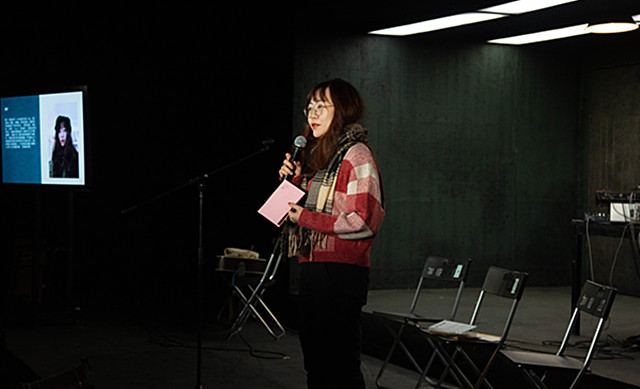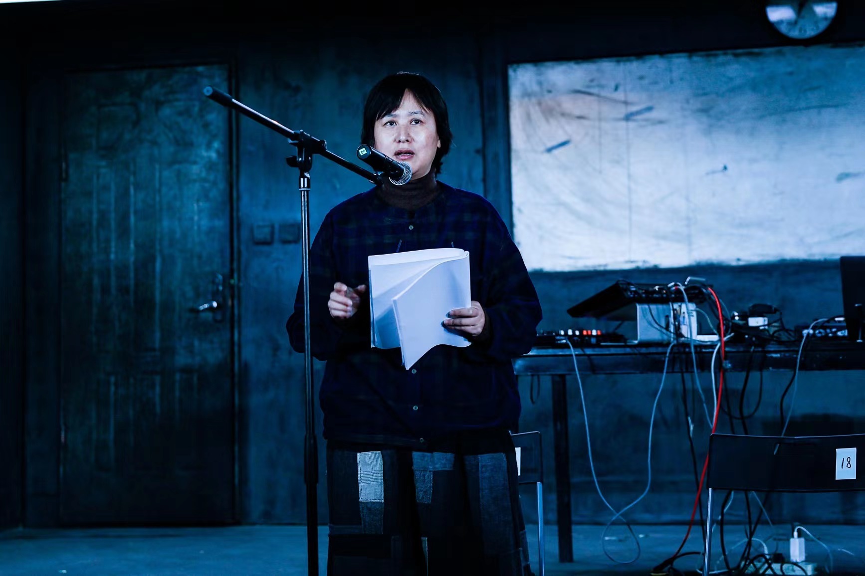 音樂人Gia Wang朗誦詩人宋逖作品時,詩集編者老賀在臺側沉思