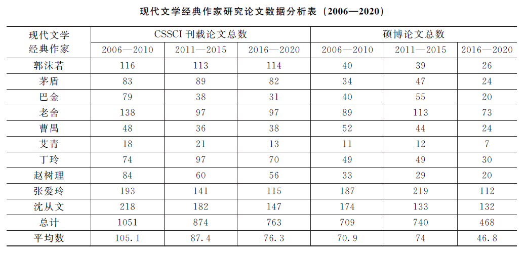 文學(xué)經(jīng)典是一個(gè)詩性的敞開空間,在生產(chǎn)與接受過程中,打上了不同時(shí)代的思想文化烙印。近百年中國新文學(xué)經(jīng)典的生成與中國社會急劇變革的歷史語境密切關(guān)聯(lián)。回顧新中國70多年現(xiàn)代文學(xué)經(jīng)典傳播接受的歷史,大致上經(jīng)歷了三個(gè)時(shí)期:20世紀(jì)50—70年代,以政治視角為主導(dǎo)闡釋經(jīng)典的30年;80—90年代,以文化視角為主要視角解讀經(jīng)典的新時(shí)期20年;2000年后,以多元話語解讀經(jīng)典的新世紀(jì)20年。整體上呈現(xiàn)為由“共名”走向“無名”的學(xué)術(shù)面向。近20年,中國現(xiàn)代文學(xué)經(jīng)典研究與市場經(jīng)濟(jì)轉(zhuǎn)型相逢,與新時(shí)期大眾文化思潮相遇,受碎片化信息傳播影響,現(xiàn)代文學(xué)經(jīng)典研究(除少數(shù)或個(gè)別經(jīng)典作家外)整體上呈現(xiàn)弱化趨勢。根據(jù)知網(wǎng)數(shù)據(jù),我們分三個(gè)五年時(shí)間段,統(tǒng)計(jì)分析了近15年(2006—2020)CSSCI來源期刊發(fā)表的研究現(xiàn)代文學(xué)經(jīng)典作家(被中國現(xiàn)代文學(xué)史列專門章節(jié)討論的重點(diǎn)作家,除魯迅外)的論文與研究現(xiàn)代經(jīng)典作家的碩博論文(見下表)。經(jīng)過比較,近5年經(jīng)典作家研究的CSSCI論文與碩博論文數(shù)量均呈現(xiàn)明顯下降趨勢。隨著高等院校碩士博士生招收數(shù)量的增加、中文專業(yè)現(xiàn)代文學(xué)研究教學(xué)從業(yè)人員的增加,現(xiàn)代文學(xué)領(lǐng)域?qū)W術(shù)成果數(shù)量整體上呈上升趨勢,但經(jīng)典作家研究論文則在減少,比例明顯下降。