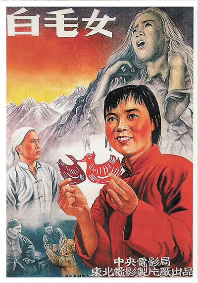 電影《白毛女》海報由享有“海報泰斗”之譽的顏地先生繪制,是一幅水粉畫。海報對比鮮明,濃縮了影片精華。畫面前景為暖色調,喜兒身穿紅色棉襖、手拿自己剪的一對紅色鴛鴦窗花,紅潤的臉龐笑容洋溢,還有一頭烏黑亮麗的秀發(fā),整個人活潑可愛。背景則為冷色調,從雪山洞窟出來的“白毛仙姑”披頭散發(fā),雙手回抱在肩,口張大、眉頭緊鎖,表情痛苦。冷色調與暖色調、黑頭發(fā)與白頭發(fā)、可愛與恐怖,這種對比的手法,深刻揭示出“舊社會把人逼成‘鬼’,新社會把‘鬼’變成人”的主題,給觀眾留下強烈的心靈震撼。