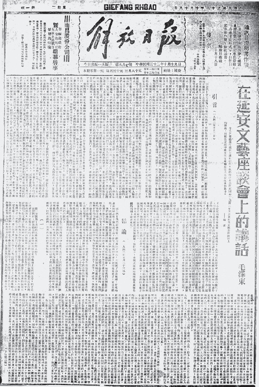 1943年10月19日,延安《解放日報》全文發表毛澤東《在延安文藝座談會上的講話》
