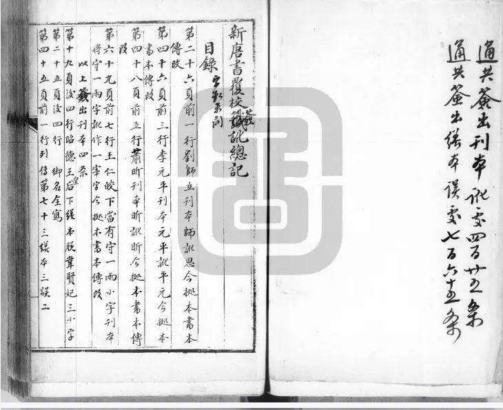 頗為吊詭的是,《校檔》中書名題署為“新唐書復(fù)校簽訛總記”的一頁上還題有“(乾隆)四十六(年)至五月初八日銷訖,送總裁,發(fā)下銷訖,又查存疑簽,辦過一半”(見圖4),據(jù)此可知,《校檔》于乾隆四十六年五月仍在四庫館銷簽,因而纂定時(shí)間必當(dāng)延續(xù)至此。又查《四庫全書薈要》史部正史類收錄《新唐書》,其提要的校上時(shí)間為乾隆四十二年正月[10],是知《新唐書》于乾隆四十二年正月前已經(jīng)辦理完竣并繕入《四庫全書薈要》,這便與《校檔》登載的《新唐書》于乾隆四十六年五月初八日的銷簽記錄相違伐。《新唐書》雖經(jīng)過分校官校閱,于乾隆四十二年抄入《薈要》,但由于《四庫全書》仍在編纂,《新唐書》又經(jīng)四庫館臣校訂,直至謄抄定本,故而《校檔》中保留了兩次《新唐書》校改記錄。《校檔》中第一次《新唐書》簽改注明“薈要”,應(yīng)屬于“薈要處”校閱《新唐書》時(shí)的復(fù)校記錄,而第二次簽改作《新唐書復(fù)校簽訛總記》,應(yīng)該是“全書處”進(jìn)行的復(fù)校,第二次簽訛時(shí)書名中增加“復(fù)校簽訛總記”六字,題名差異恰能反映兩次簽訛的區(qū)別。再從兩次簽改的具體內(nèi)容來看:第一次作“繕本《考證》一頁三行應(yīng)加〇,馀無誤。刊本無簽”,第二次作“刊本無訛。三頁后二行‘扂’誤‘居’,八頁六行‘臣’誤‘誠’,以上簽出繕本二條”。對比前后兩次的內(nèi)容,《新唐書》的謄錄者已經(jīng)部分采納了第一次簽改的意見;館臣第二次校簽時(shí),刪去了加〇的內(nèi)容,并補(bǔ)充多條有關(guān)繕本《新唐書》的訛誤。再如第一次簽改中卷二百二十二下與卷二百二十三上皆著錄“苻堅(jiān)誤作符堅(jiān)”;第二次簽改卷二百二十三上時(shí),四庫館臣用墨筆勾乙刪去此條。由此可知《新唐書》第二次內(nèi)容較第一次有所刪改。據(jù)此,《校檔》中登載乾隆四十六年五月《新唐書》仍在四庫館銷簽,應(yīng)屬于全書處復(fù)校流程,與薈要處無涉。