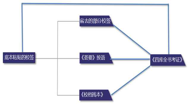 值得注意的是,校檔還與《四庫全書考證》的編纂密切相關(guān)。相關(guān)研究表明,《考證》乃是館臣擇取黃簽匯編而成,而黃簽其實(shí)就是校簽的一種,只不過由于需要進(jìn)呈御覽,所以區(qū)別于一般校簽[24]。《校檔》中《新唐書》和《釋音》后有“凡黃簽須明白曉暢,進(jìn)呈時(shí)一覽了然,若重沓支離,均不足取,倘太簡略,又不可以此籍口急索解,人不可得尚其旦暮遇之”,據(jù)此可知,《校檔》是黃簽加工過程中的載體之一,很可能是《四庫全書考證》成書過程中的重要一環(huán)。循此路徑,將《考證》與《校檔》的校簽一一核對,發(fā)現(xiàn)二者并不能完全對應(yīng)。除《考證》所錄《新唐書》與《釋音》的簽改意見均能在《校檔》中找到出處外,其他各書的簽訛內(nèi)容,皆互有異同。由于《校檔》中《新唐書》與《釋音》抄寫工整,且抄紙有界欄,與各書不同,猜測這兩書應(yīng)是復(fù)校核對簽訛記錄后,重新謄抄的較為整飭的內(nèi)容,因此在編纂《考證》時(shí)可直接從中選擇黃簽。而且,《四庫全書薈要》中的按語,也與《校檔》或《四庫全書考證》多有不同。筆者認(rèn)為這三種簽改內(nèi)容,皆由粘貼在底本上的校簽轉(zhuǎn)化而來,在《薈要》與《四庫全書》的編纂過程中,有些底本上的校簽作為按語抄入《薈要》,部分內(nèi)容則移錄至校檔。館臣自底本校簽、《薈要》按語、校檔中選擇校簽加工成黃簽,再將黃簽匯編成《四庫全書考證》,具體的流程或如下圖: