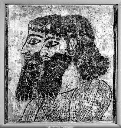 亞述是一個軍事帝國,為了渲染戰爭勝利,亞述人將美索不達米亞浮雕藝術發展到巔峰。亞述存世的藝術品多為表現戰爭及獵獅的浮雕,而壁畫很少,只有現今敘利亞境內的泰爾·阿赫馬爾遺址殘留有約130米的壁畫,屬于提格拉特·帕拉沙爾三世(公元前744年—公元前727年在位)時期。此次敘利亞精品展便有其中一幅壁畫截圖,現收藏在敘利亞阿勒頗博物館。該壁畫截圖描繪的是兩位男子胸部以上半身像,用粗黑線條勾畫,人物濃眉大眼、頭系發帶、須發茂密,須發中隱約可見螺旋卷紋,具有與亞述浮雕藝術一致的風格。