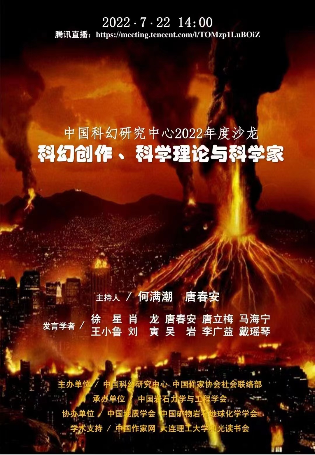 7月22日,中國科幻研究中心2022年度沙龍活動之一“科幻創作、科學理論與科學家”以騰訊會議的方式舉行。此次沙龍活動由中國科幻研究中心、中國作家協會社會聯絡部主辦,中國巖石力學與工程學會承辦,中國地質學會、中國礦物巖石地球化學學會協辦,中國作家網和大連理工大學和光讀書會提供學術支持。