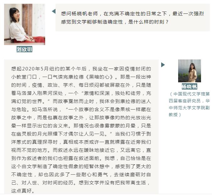 鄧小燕:我對(duì)現(xiàn)代文學(xué)館的客座研究制度還不是很了解,在網(wǎng)上查了,黃德海老師的話應(yīng)是過(guò)來(lái)人的真實(shí)感受,我抄作業(yè)錄在這里:“中國(guó)現(xiàn)代文學(xué)館的客座研究員培養(yǎng)機(jī)制是非常完善的交流和提升平臺(tái),在組織活動(dòng)、發(fā)現(xiàn)人才、激發(fā)寫(xiě)作方面做出了非常重要的貢獻(xiàn)。”
