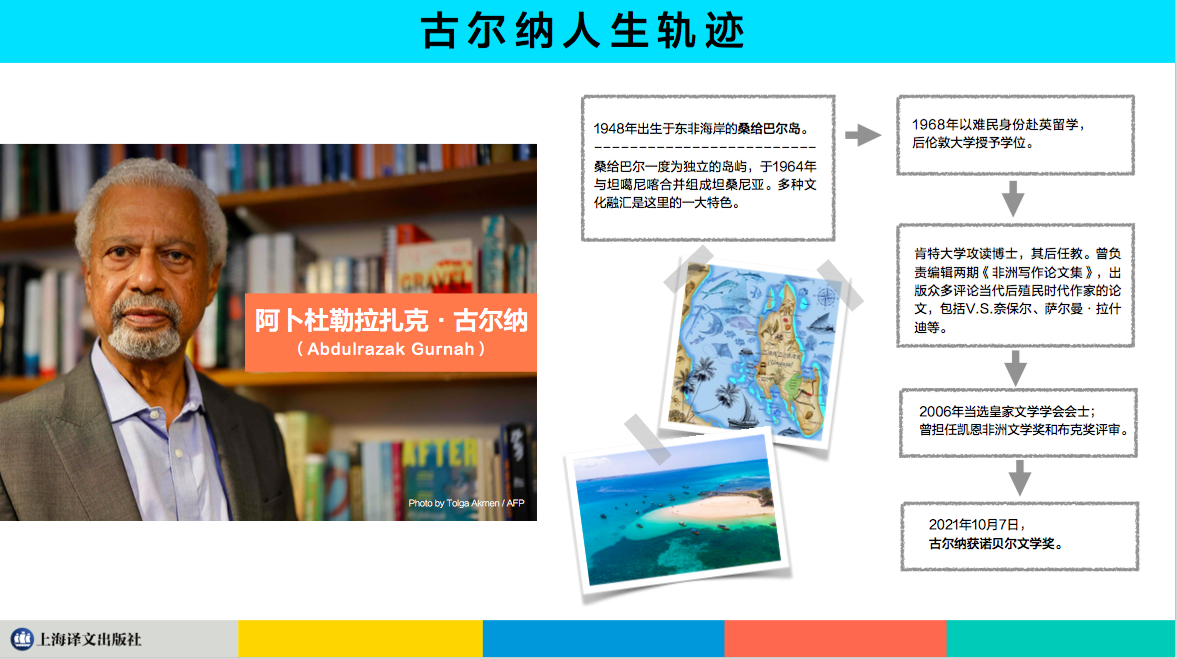 1948年,古爾納出生在東非海岸附近的桑給巴爾島,1968年以學(xué)生的身份來到英國,并用英文寫作。他不僅是小說家,也是一位文學(xué)研究者,曾在肯特大學(xué)(University of Kent)擔(dān)任英語教授,退休后擔(dān)任文學(xué)雜志《瓦薩非瑞》(Wasafiri)的顧問委員會(huì)成員,現(xiàn)居坎特伯雷。2021年,“因?yàn)樗麑χ趁裰髁x文學(xué)的影響,以及對身處于不同文化夾縫中難民處境毫不妥協(xié)且富有同情心的洞察”,古爾納被授予諾貝爾文學(xué)獎(jiǎng)并受到廣泛關(guān)注。