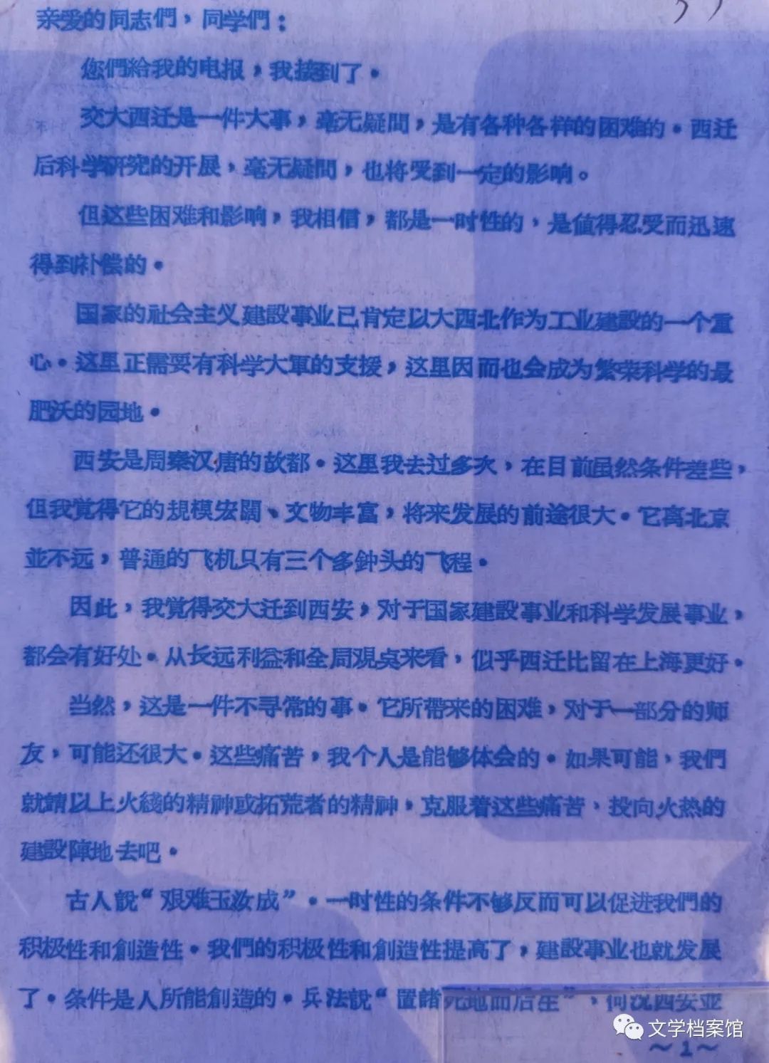 因此,我個人的意見,是希望交大全部西遷。當然,我并未身當其境,我的這些意見只供師友們參考。如果有一部分的師友實在有不能克服的困難,個別的例外我相信國家是能夠體諒的,不會以強迫行事。專復,致以
