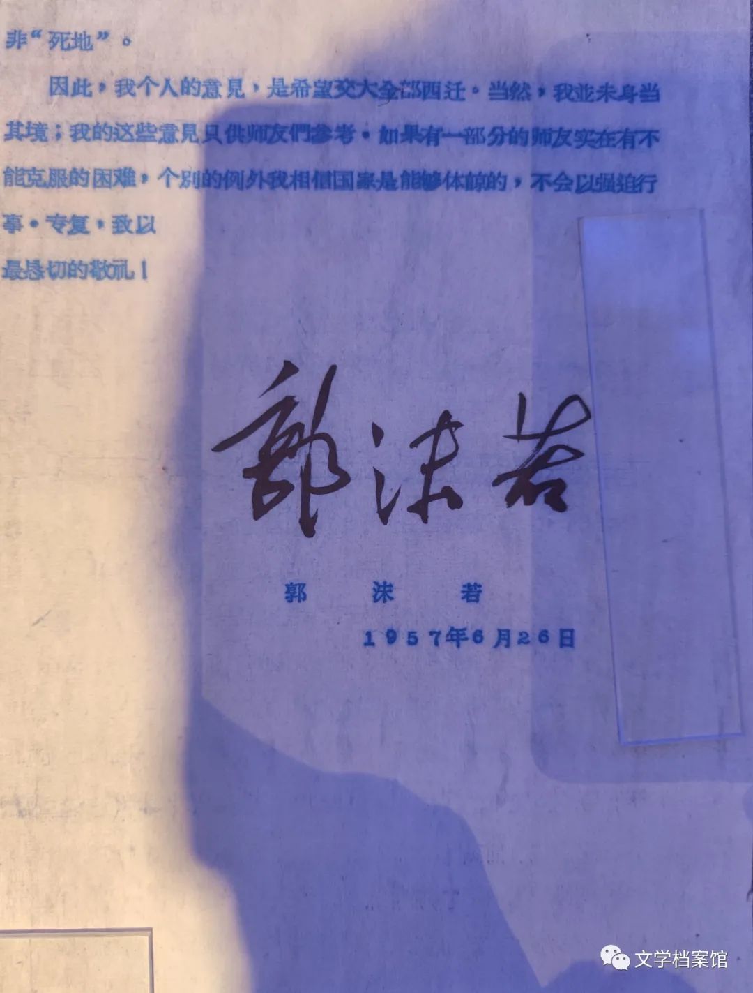 郭沫若在信中首先表示交大西遷將會遇到各種各樣的困難,西遷后科學研究也會受到影響。接著,他分析了西遷的優勢,國家的社會主義建設事業已肯定以大西北作為工業建設的一個重心。那里正需要有科學大軍的支援,因而也會成為繁榮科學的最肥沃的園地。同時結合自己的經歷予以說明:“西安是周秦漢唐的故都。這里我去過多次,在目前雖然條件差些,但我覺得它的規模宏闊、文物豐富,將來發展的前途很大。”事實上,郭沫若確曾多次前往西安,并在西安各處留下他的筆墨痕跡。信的最后,郭沫若勉勵師生們以“上火線的精神”,投入到廣闊的大西北建設中去,并正式亮明自己的觀點:“我覺得交大遷到西安,對于國家建設事業和科學發展事業,都會有好處。從長遠利益和全局觀點來看,似乎西遷比留在上海更好。”“我個人的意見,是希望交大全部西遷。”他還想到如果有一部分的人實在有不能克服的困難,個別的例外國家是能夠體諒的,不會以強迫行事。這是郭沫若的思慮周全之處。