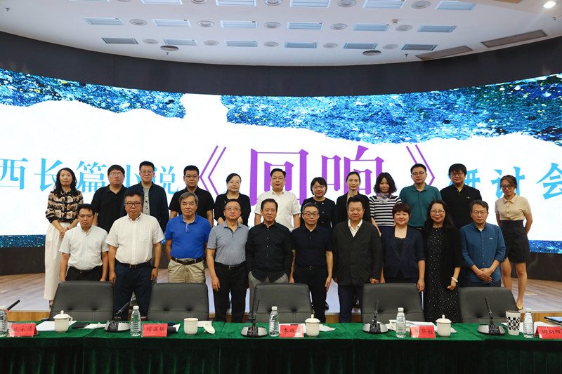 東西長篇小說《回響》研討會合影。第一排左起:李紅強、臧永清、潘凱雄、閻晶明、李敬澤、東西、邱華棟、何向陽、張燕玲、李洱;第二排左起:劉稚、宋嵩、饒翔、徐則臣、張莉、徐濤、李東華、趙萍、岳雯、陳濤、叢治辰、李蔚超。
