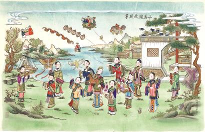 楊柳青經(jīng)典年畫《十美圖放風箏》鮮活詮釋清末流行的同名時調(diào)小曲,將姑娘們放風箏的動態(tài)生動呈現(xiàn)