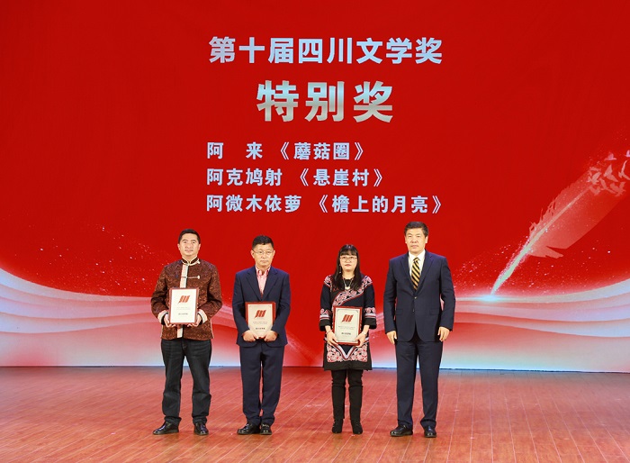 本屆四川文學獎還設立了“特別獎”。阿來的《蘑菇圈》、阿克鳩射的《懸崖村》、阿微木依蘿的《檐上的月亮》三部作品上榜。