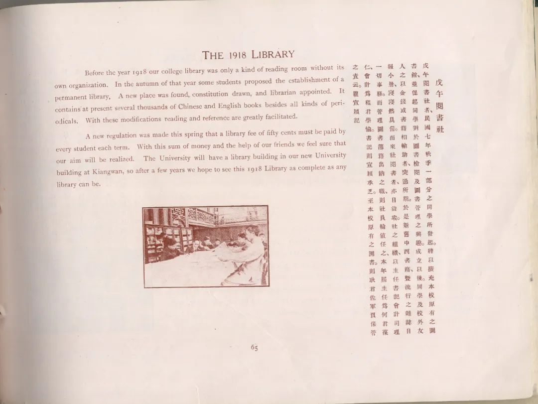 值得一提的是,部分年刊中對校史的記載,有助于我們從歷時性的視角了解學校在添設課程、更換教授、增新建筑物等各方面的發展變化。以圖書建設為例,1919年《復旦年刊》中有瞿宣穎所撰《戊午閱書社》“戊午閱書社者,民國七年秋季一部分之同學所發起,將以擴充本校原有之圖書館,并促起同學對于圖書檢閱及圖書管理之興趣。”“本年屆主任為何葆仁,會計為程學愉,書記則宣穎承乏。至本校原有之圖書,則耿君佐軍保管之責云。”是為復旦圖書館之最早雛形。又1925年《復旦年鑒》載文《復旦大學圖書館簡史》稱“一年以來,凡書籍分類、編號將次就緒,全館圖書增至五千九百八十六冊。本學年又添購六百余冊,又承劉大白先生寄存二千余冊,杜定友先生寄存八百余冊,合計存書將近萬卷,較二年前幾增一倍。”可知1925年全校藏書規模已將近萬冊。至1935年時任圖書館主任吳耀中撰文《本校圖書館概況》云“二十一年滬戰之際,本館幸得保存,惟重加整頓,費時甚久,前各系圖書室現均改稱研究室,年來努力充實內容,書籍猛增,是為本館發展程上之突飛猛進時期”(見1935年《三十年的復旦》),吳氏文末特附圖表加以說明,其中《歷年藏書統計表》所列為1926年至1935年藏書中日文、西文及總計數量,1926年總計11182冊,1935年總計為34260冊。年刊所記呈現了復旦圖書館在初創階段從無到有、篳路藍縷的發展過程。