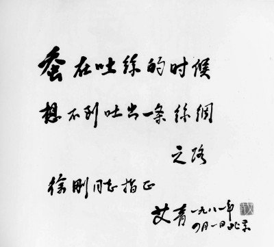 記得那一次在豐收胡同的告別,多少有點(diǎn)凄涼,冷月斜照,燈影昏黃,我說:“老艾,你該休息了?!卑喟盐罩氖炙砷_說:“你要常來。”我讓艾青回家,他不回?!澳阕吡宋揖突?。”回頭,艾青還在院門口站著;再回頭,那影子模糊了。